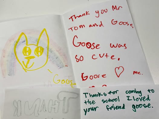 Goose, our demo dog, has been busy! He was invited to visit two groups of fourth graders at Mounds Park Academy, where we got to talk about how service dogs help people with disabilities. The students asked questions about training, daily tasks, and what it means for a dog to support their person. Classroom visits like these help children grow up seeing service dogs as part of community life and build their understanding of how the dogs help.